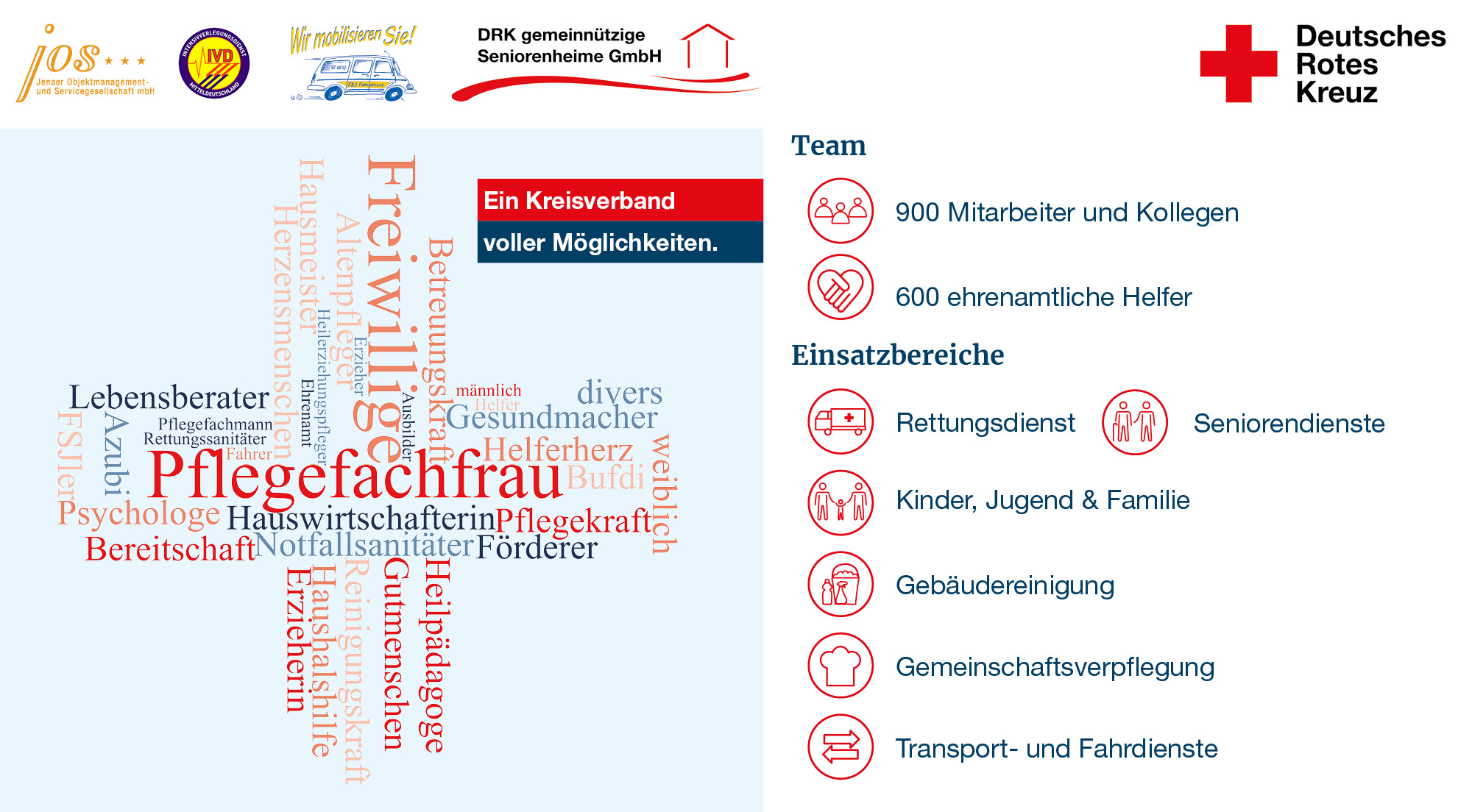 Der DRK-Kreisverband Jena-Eisenberg-Stadtroda e.V. mit seinen Geschäftsbereichen Nationale Hilfsgesellschaft, Kinder, Jugend & Familie und Seniorendienste ist seit mehr als 20 Jahren ein großer sozialer Dienstleister in der Region Jena und im Saale-Holzland-Kreis und ein verlässlicher Arbeitgeber mit sozialer Verantwortung für seine Mitarbeiterinnen und Mitarbeiter.